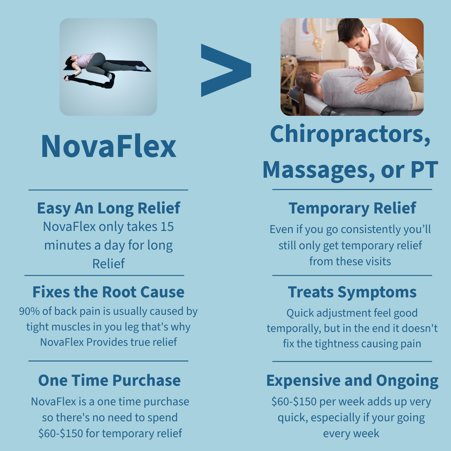 Our goal at NovaFlex is to help our customers with back pain and health as much as possible. And we know that NovaFlex isn’t for everybody—that’s why we have a 30-day money-back guarantee, so you’ll either cure your back pain and improve your health or get your money back.